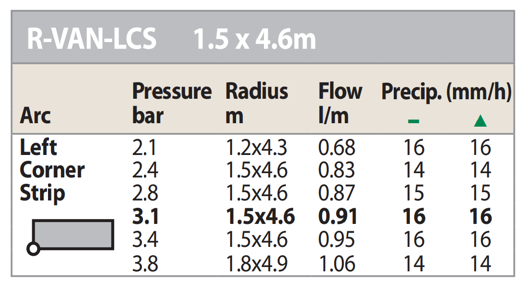 Duza Rain Bird R‑VAN LCS este special proiectată pentru colțuri stângi ale peluzelor sau benzilor înguste de gazon. Cu modelul „strip” de 1,5 × 4,6 m, oferă o distribuție uniformă, un jet puternic și un consum redus de apă, chiar și în zone dificile.